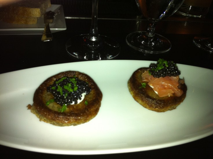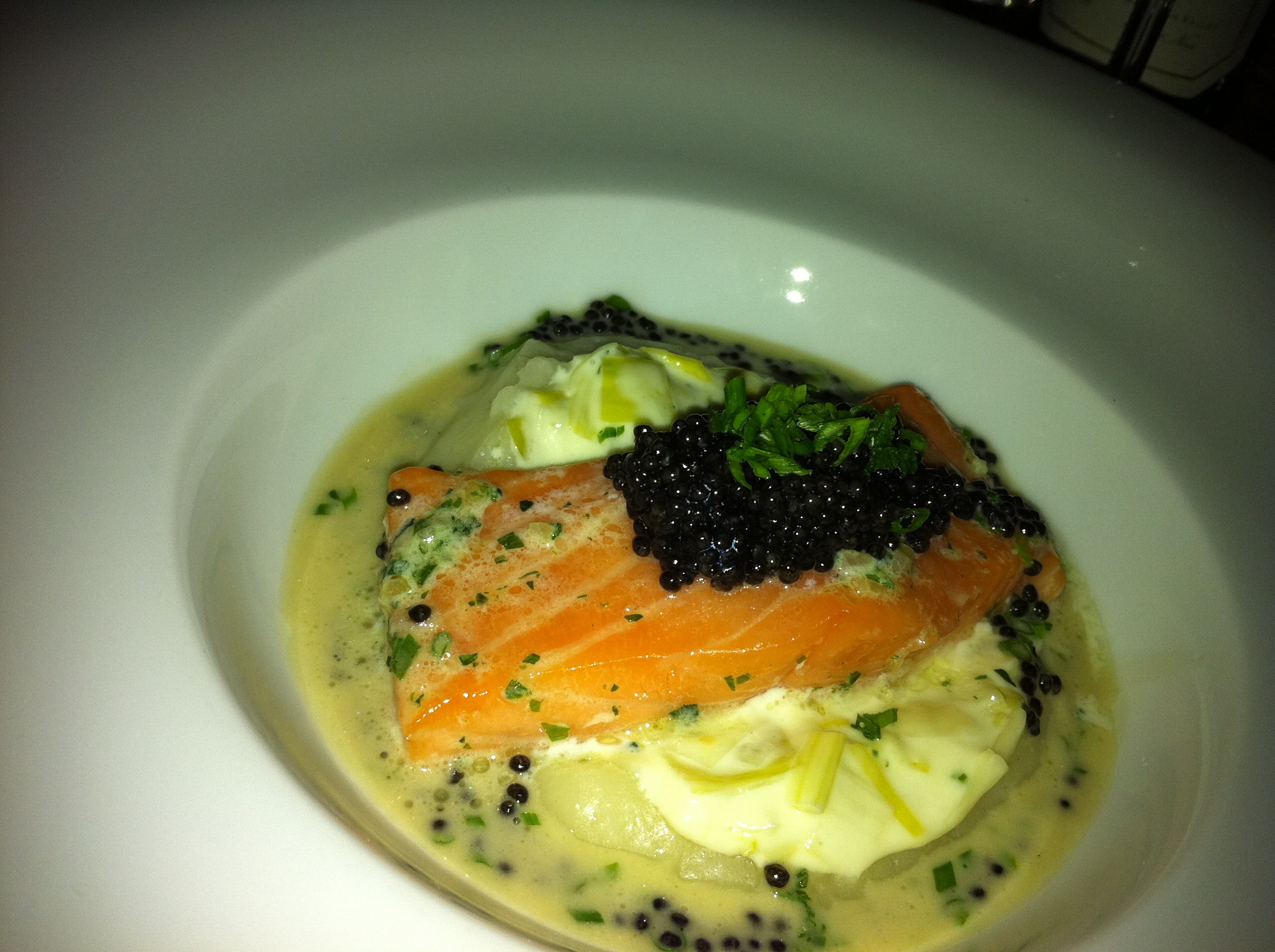 After this dish, they decided to surprise us with a little something special. This is due to Mike’s relationship with the staff. He is friends with a lot of the folks there and we brought in a little extra caviar. It just so happened to make it’s way onto our next dish, which I believe was the salmon medallion from the set menu.