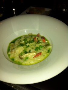 We’ve chosen the Pinot for it’s versatility with seafood and meats. Next up is a Lobster Risotto. This is definitely a contender for best dish of the night. The lobster is delicious and plentiful. Sorry for the unspectacular picture. It is not worthy of the dish.
