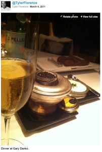 Moving forward, we will post one pic a week. We will try to keep the pics we post within the week they are posted, but for this week we aren’t. This picture is just too good pass up. This is Chef Tyler Florence (@TylerFlorence on Twitter) getting caviar service at Gary Danko. Link below to the Twitpic: