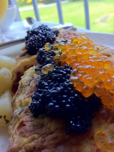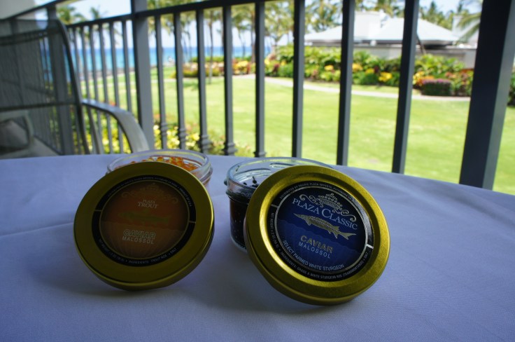 As you’d expect, we had a little caviar on the trip and our meal of choice was an omelet. Staying at the Fairmont Orchid, we ordered some room service. We decided on the three egg omelet that we chose to supplement with some trout roe and Siberian sturgeon.