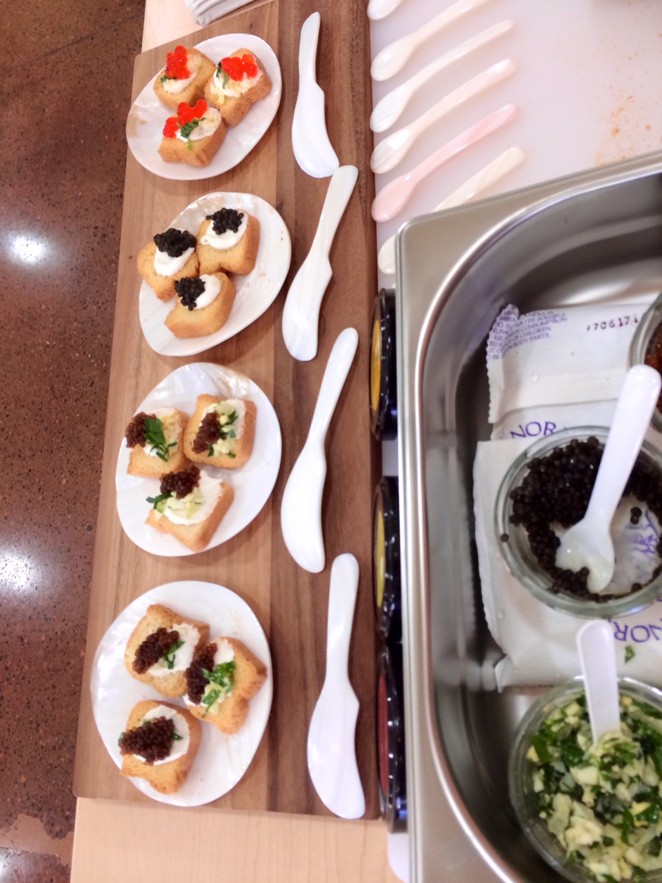 Grand reopening of Bevmo Van Ness in SF featured a wonderful parings of Plaza Caviars & Mote Champagnes. Caviarblog was excited to provide the tasting station. All three caviar offerings paired with unique Mote bubbles, Clique, Rose, and Imperial all of which were very well received. Dry Champagne has the perfect characteristics to counter balance rich roes, enhancing the rich buttery brine flavor of the caviars. We paired the first with Wild Salmon Roe, the second with Truffle infused Whitefish, and the Imperial was paired with ultra posh Osetra from our signature farm in Bulgaria……..So Delish – Ali