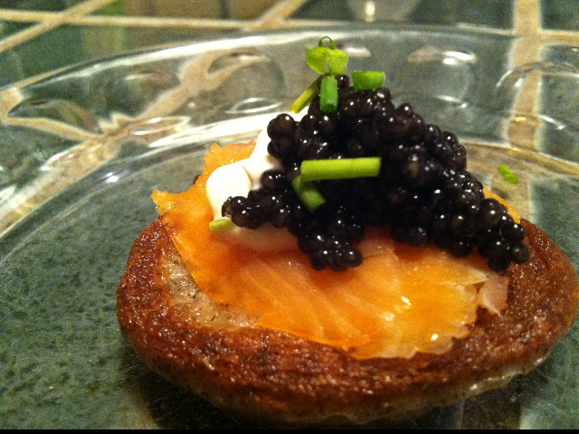 Blini toppings: smoke salmon, creme fraiche, California White Sturgeon Caviar, and chives to garnish. https://caviarblog.com/2012/02/04/buckwheat-blini-recipe/